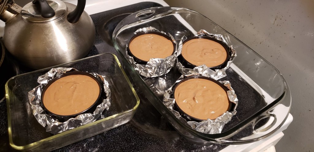 With that success under my belt, I’m starting to feel pretty good. A friend of mine has gone through a medical event recently and I figured I’d use this as a reason to try again, maybe with a flavored version. Extra wrinkle, my friend is gluten-free. I got my 4 4″ mini springform pans and went to town on a Mexican mocha cheesecake.